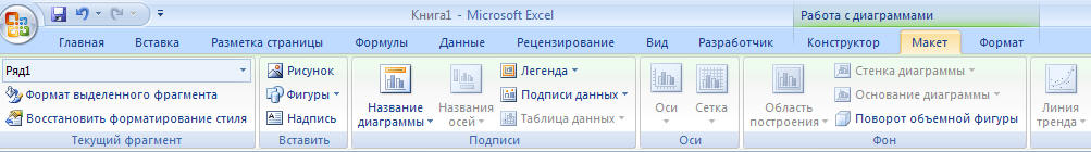 С помощью вкладки Макет Закладки Работа с диаграммами добавим в диаграмму Название диаграммы, Подписи данных.