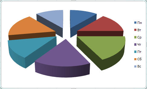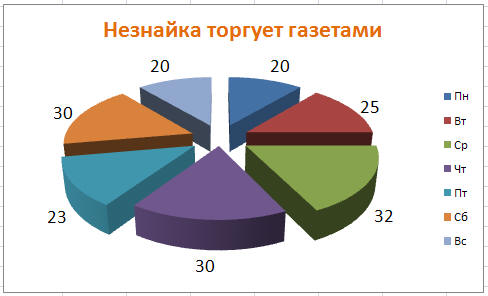 Пример 1. Для примера построим круговую диаграмму «Незнайка торгует газетами». Незнайка в течение недели торговал газетами и продал следующее их количество: