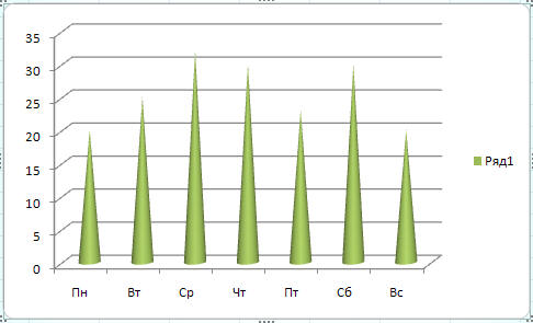 Выделим данные в таблице и с помощью команды Вставка выберем Гистограмма / Коническая:
