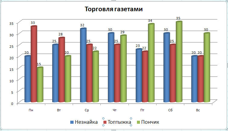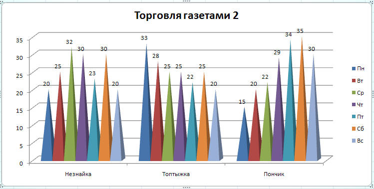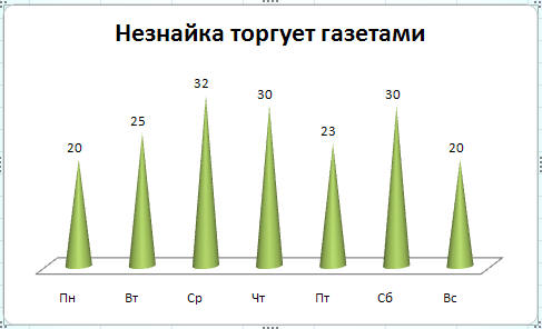 Пример 2. Для примера построим столбиковую диаграмму «Незнайка торгует газетами».