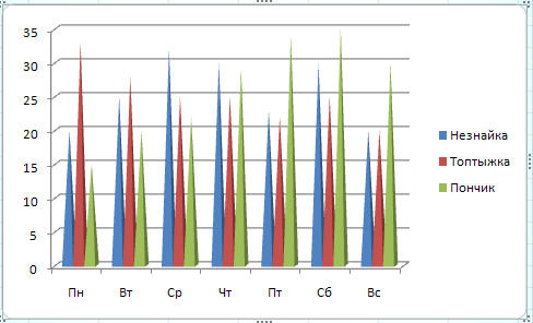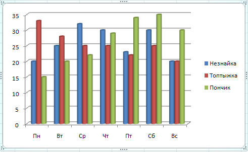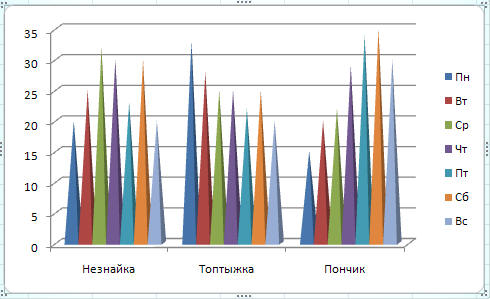 Построенная нами диаграмма нацелена на то, чтобы сравнивать количество газет, проданных разными продавцами в каждый из дней, т. е. на сравнение результатов работы разных продавцов.