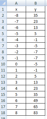 1. В ячейки В3:В19 введите числа от -4 до 4 включительно с шагом 0,5.