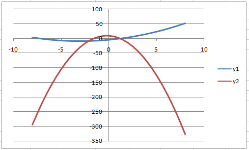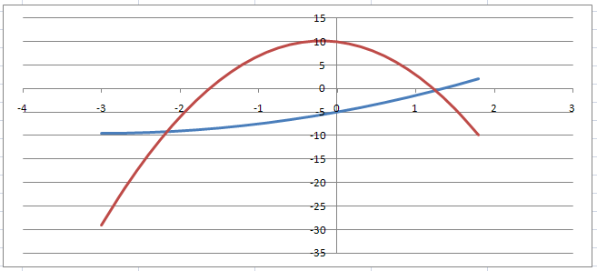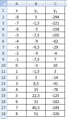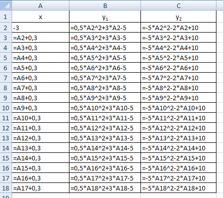 В ячейку В2 введем =0,5*A2^2+3*A2-5, а в С2 введём =-5*A2^2-2*A2+10.