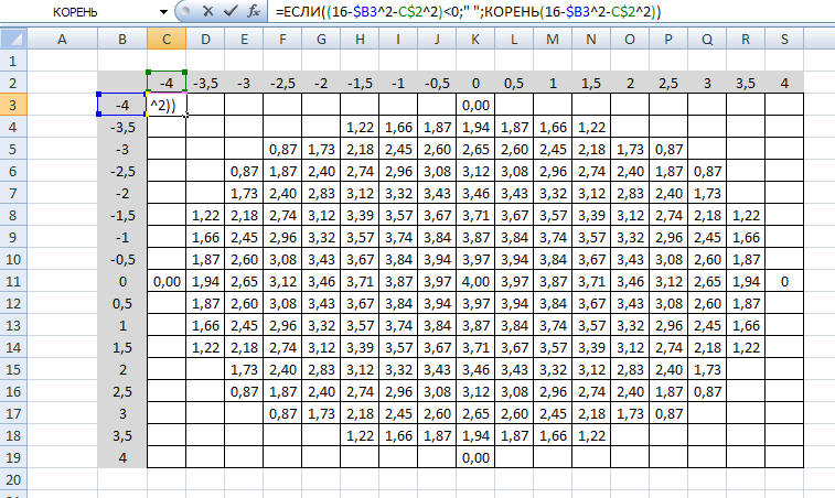 3. В ячейку С3 нужно ввести формулу для вычисления =КОРЕНЬ(16-$В3^2-C$2^2) и распространите её с помощью маркера заполнения вниз до ячейки С19. Но подкоренное выражение иногда принимает значение нуль. Поэтому с помощью условного оператора при вычислении значения меньше нуля будем выводить пробел, а иначе вычисление. Поэтому в С3 нужно ввести формулу =ЕСЛИ((16-$B3^2-C$2^2)<0;" ";КОРЕНЬ(16-$B3^2-C$2^2)).