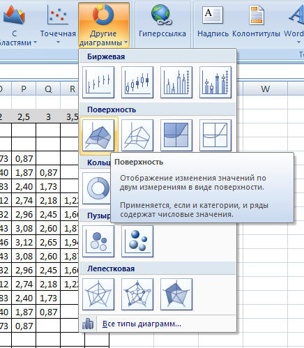 4. Диаграмма строится стандартным способом. Выделите все данные и выберите тип Другие диаграммы / Поверхность.