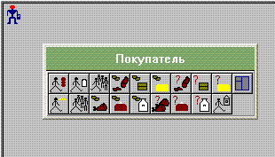 Неактивный исполнитель Покупатель изображается в виде маленькой фигурки человека одного из шести цветов: синего, серого, зеленого, фиолетового, коричневого или черного. Фигурка имеет голову красного цвета, если данный исполнитель активен, и голову белого цвета, если исполнитель находится под отладкой. Покупатель считается частично непрозрачным исполнителем (со время движения исполнитель может проходить по клеткам, занятым другими исполнителями, но остановиться должен обязательно в свободной клетке).