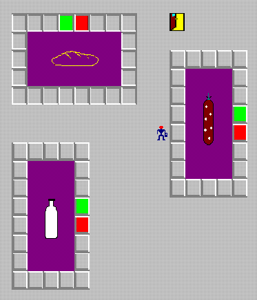 Каждый отдел представляет собой прямоугольник размерами 5 клеток на 8 клеток. По периметру располагаются клетка входа в отдел (красная), клетка выхода из отдела (зеленая) и 22 клетки для очереди. Внутри отдела может находиться только один покупатель, в очереди максимально может находиться 22 покупателя. Подойти_К_Мяснику Покупатель подходит к отделу мясника. Подойти_К_Булочнику Покупатель подходит к отделу булочника. Подойти_К_Молочнику Покупатель подходит к отделу молочнику. Встать_В_Очередь Покупатель занимает очередь к прилавку. Отойти_От_Прилавка Покупатель выходит из очереди к прилавку. Купить_Мясо Покупатель покупает мясо у мясника. Купить_Колбасу Покупатель покупает колбасу у мясника. Купить_Хлеб Покупатель покупает хлеб у булочника. Купить_Пирожное Покупатель покупает пирожное у булочника. Купить_Молоко Покупатель покупает молоко у молочника. Купить_Масло Покупатель покупает масло у молочника. Покинуть_Магазин Покупатель двигается к выходу из магазина и исчезает с экрана.