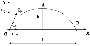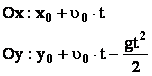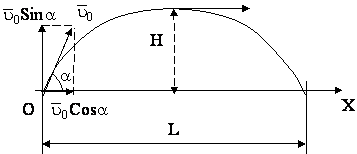Движение тела, брошенного под углом к горизонту, также можно разложить на два независимых движения: равномерное прямолинейное, происходящее в горизонтальном направлении с начальной скоростью v0х = v0·Cosα и свободное падение с начальной скоростью v0у = v0·Sinα, (рисунок 1.8). Где α - угол между направлениями вектора скорости υ0 и осью Ох. Траекторией такого движения является парабола. Уравнения движения примут вид: