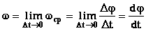 Угловой скоростью (мгновенной угловой скоростью) ω называется предел, к которому стремится средняя угловая скорость при бесконечном уменьшении промежутка времени ∆t, или первая производная от угла поворота по времени:
