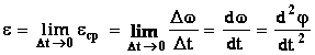 Угловым ускорением (мгновенным угловым ускорением) вращающегося тела в момент времени t называется величина ε, равная пределу, к которому стремится среднее угловое ускорение за промежуток времени от t до t + ∆t при бесконечном уменьшении ∆t, или, угловое ускорение - это первая производная от угловой скорости по времени или вторая производная от угла поворота по времени: