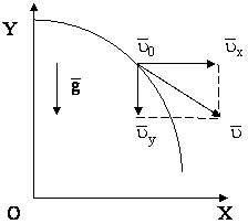 Движение тела, брошенного с некоторой высоты, можно разложить на два независимых движения: равномерное прямолинейное, происходящее в горизонтальном направлении со скоростью υх , равной начальной скорости бросания υ0 (υх = υ0), и свободное падение с высоты, на которой находилось тело в момент бросания, с ускорением g. Для описания этого движения выбирают прямоугольную систему координат хОу. Траектория движения является ветвь параболы (рисунок 1.6).