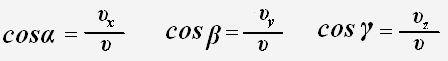 где α , β , γ -углы между вектором скорости и осями x, y, z соответственно.