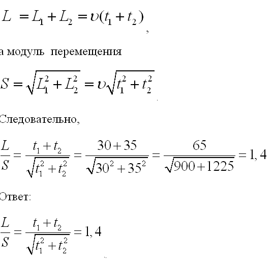 Самолет летел сначала на север в течение 30 мин, а затем с той же по модулю скоростью, - на восток в течение 35 мин. Во сколько раз путь самолета больше модуля его перемещения?