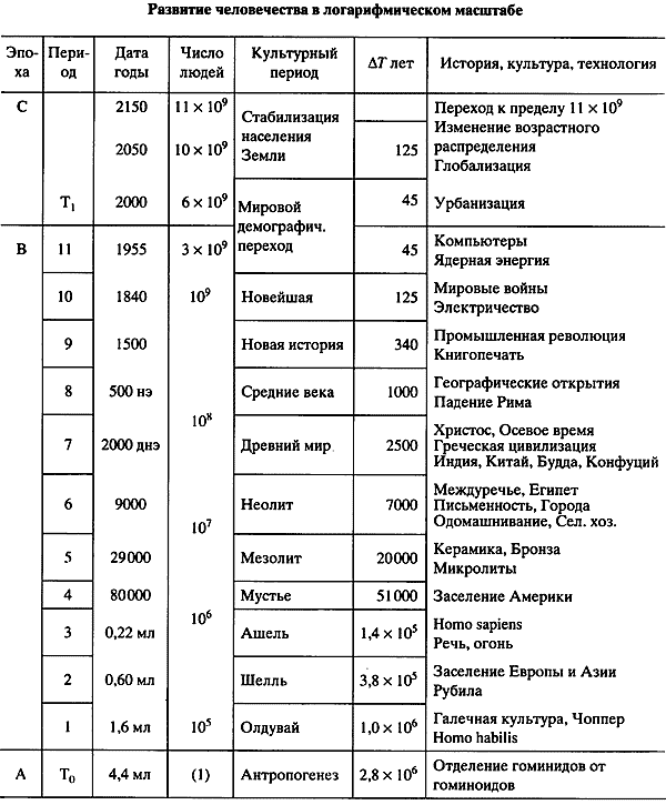 Приводимая таблица представлена в логарифмическом масштабе времени, которое исчисляется в прошлое от настоящего - с момента мирового демографического перехода. Заметим, что такое представление времени традиционно принято в антропологии [8]. Это связано с тем, что иначе трудно представить в одной таблице хронологию каменного века, который начинается с нижнего палеолита, длительностью в миллион лет, и кончается неолитом, длительностью всего в 7 тыс. лет. В силу такого большого диапазона значений антропологи и обратились к логарифмическому представлению своих данных. Мы же теперь видим, что это соответствует естественной логарифмической хронологии развития человечества, следующей из модели.