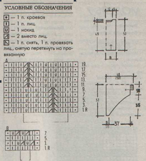 Плотность вязки: для узора А - 28 п х 39 р = 10 х 10 см, для узора В - 18 п х 42 р = 10 х 10 см,