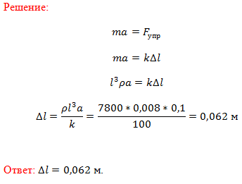 Под действием пружинного динамометра железный кубик с длинной ребра...Под действием пружинного динамометра железный кубик с длинной ребра 20 см движется по гладкой горизонтальной поверхности с постоянным ускорением, модуль которого a=10 cм/c2. Определите удлинение пружины динамометра жестокостью k=100 Н/м.